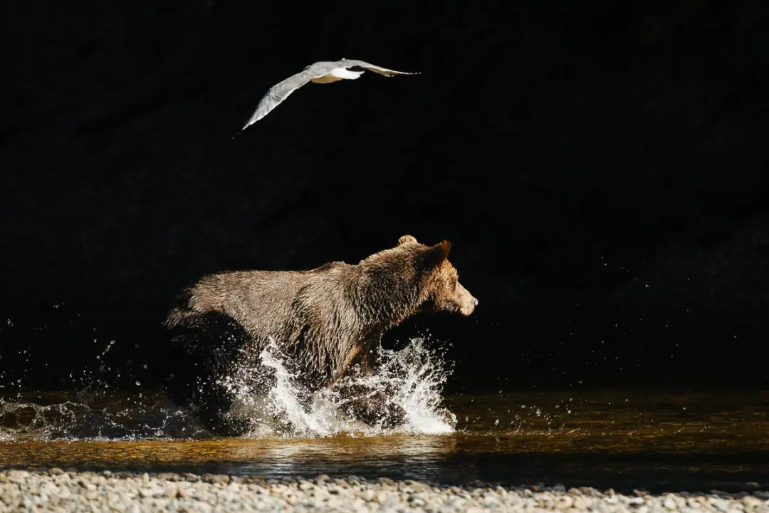 One particular morning, I sat patiently along a riverbank cloaked under the forest canopy for hours, hoping for a bear to swim past. Just as we were growing restless and considering leaving, a massive male grizzly emerged upstream from the dense forest. Its coat shimmered with water droplets as it moved toward us. But suddenly, it froze, spooked, and darted back into the trees. Confused, we quickly realized why—a female grizzly and her cub came barreling around the bend, chasing salmon through the shallows.
