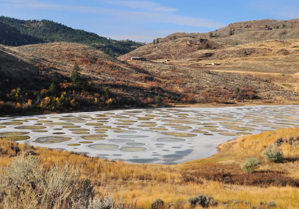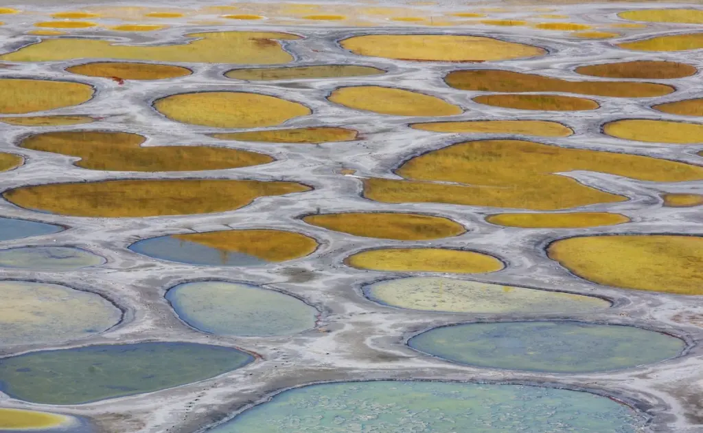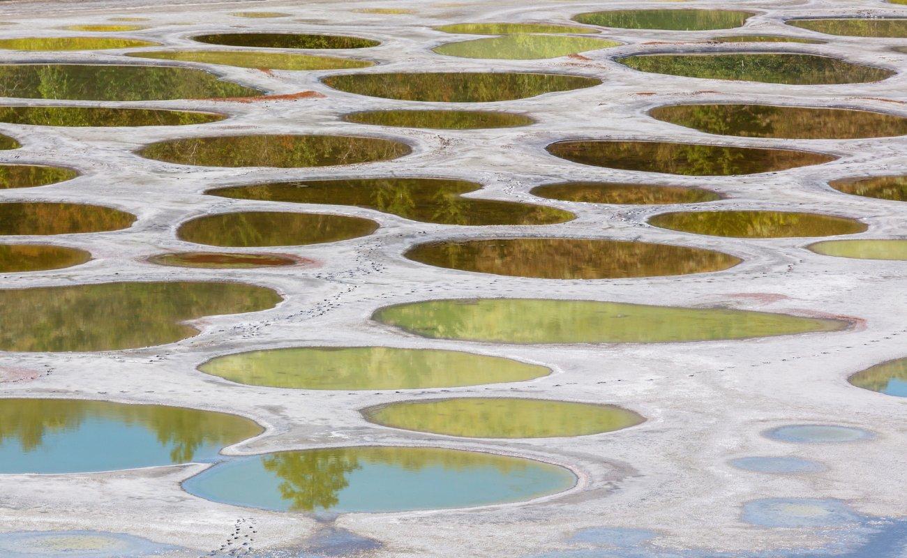 As one of the most mineralized lakes in the world, ktlil'xw also contains one of the highest concentrations of Epsom salts but is also rich in calcium and sodium sulphates. Although it looks like a body of water during winter and spring, the lake transforms into a magical polka dotted landscape of yellow, blue and green “spots” in the hot summer months when much of the water evaporates. The pools also change in size and colour depending on the time of day and season which affects the amount of evaporation, plus its mineral content.