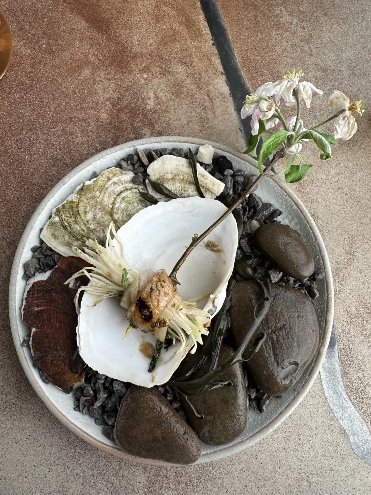 Before our dinner, we embarked on a garden tour, something guests can book to experience before their dinner. This is something we highly recommend. Farmer Shane Harper and gardener-forager Deirdre Fraser give guests such an eye-opening view of what regenerative and sustainable farming can look like. They are extremely knowledgeable. During our tour, we had the opportunity to learn all about the different herbs, flowers, and vegetables that are grown in the vast garden, in addition to tasting them. Both Chef Hadida and Chef Robertson also made appearances throughout the tour. From rose thyme, and sweet grass, to sweet cicely, surprises included plants that tasted like citrus and pineapple.