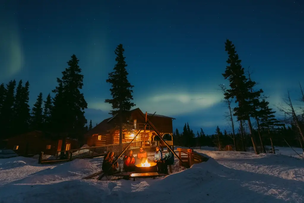 Most first-time aurora travellers base themselves in Whitehorse, where dozens of operators run nightly tours during the season. A typical evening begins with a pickup in town around 10:00 PM. Expect a short drive, usually about half an hour. That’s enough time to transport you into the wilderness, away from city lights, to a heated cabin or camp. Once you are there, it is a mix of anticipation and comfort: guides keep the fire going, hot drinks and snacks are served, and everyone waits for the show in the sky to begin.