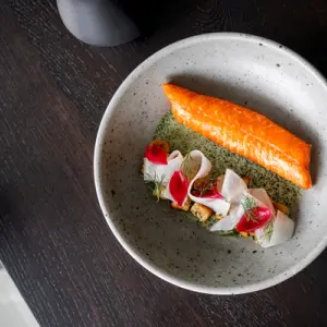 Penticton, BC is home to family-owned Kin & Folk – a restaurant co-founded by chef Zachary Chan that blends Asian flavours with Canadian ingredients. Featuring a refined room with calm ambiance and a beautifully inviting garden patio, it's worth a stop for a meal come rain or shine. Two must-order items are the Ginger Beef Double Double, a unique take on a Calgary-born, classic Chinese Canadian dish reimagined in burger form, and the Chef's favourite dish - Cantonese-inspired Soy Chicken, featuring soy glazed roast chicken, pickled things, and scallion cashew cream.