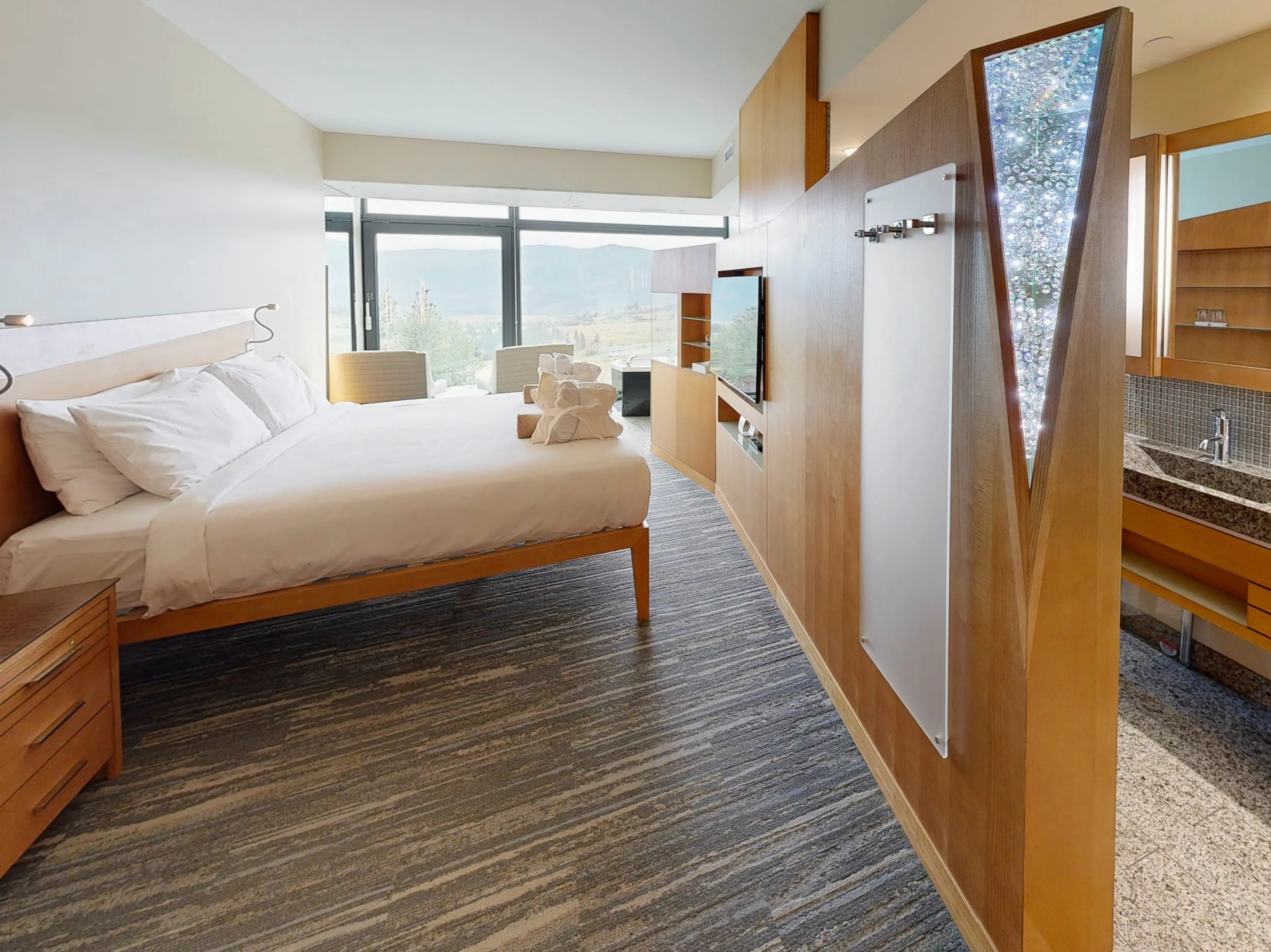 We stayed in a Lake View room and immediately fell in love with the panorama. Floor-to-ceiling windows framed Okanagan Lake as we soaked in a two-person soaker tub while watching flickers of light dance across the water at sunset. The open-concept layout includes a glass-walled shower, custom wellness beds, and Swarovski crystal accents. The rooms remain cool and serene even during summer heat; plush robes and slippers invite you to move effortlessly between the suite and spa.