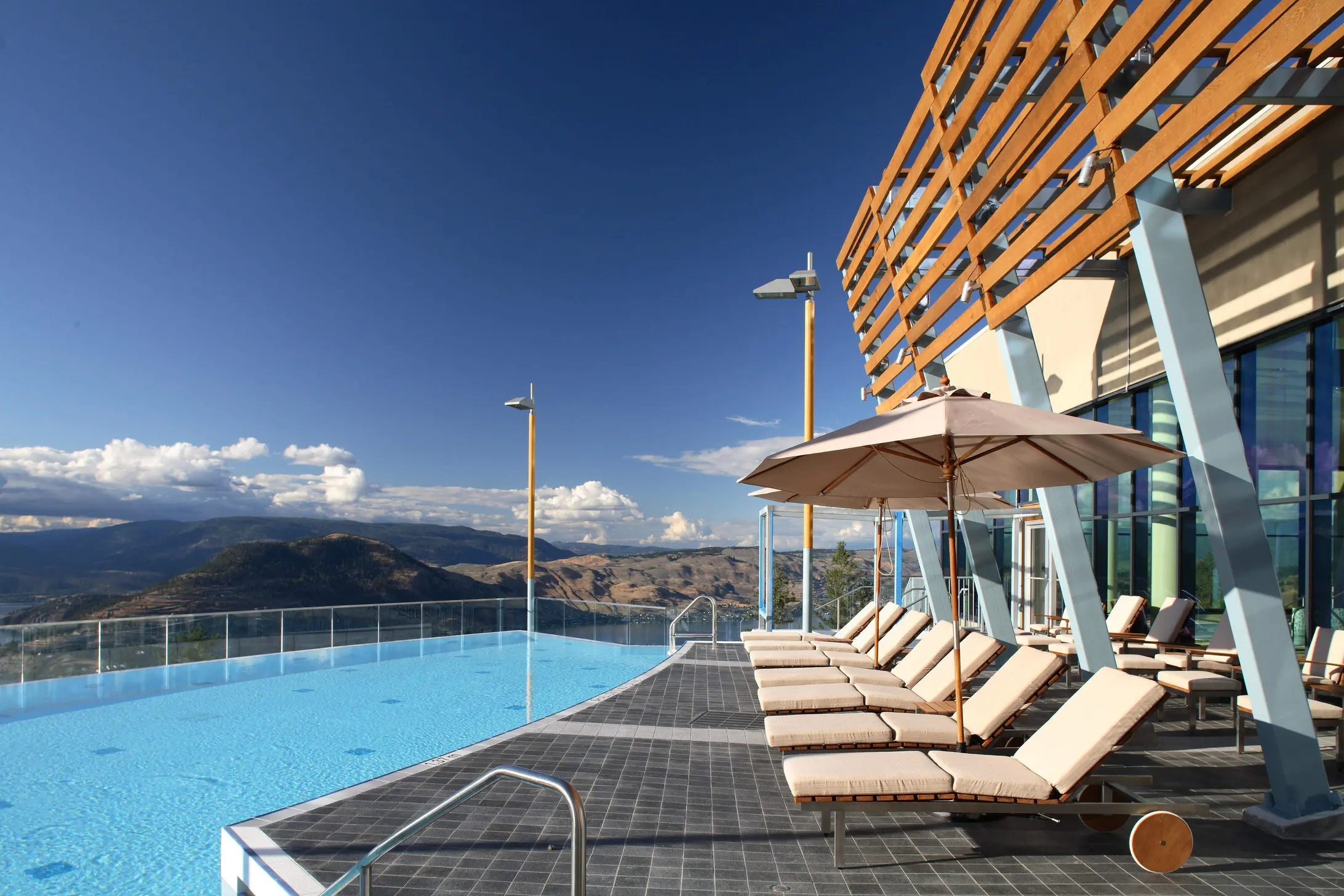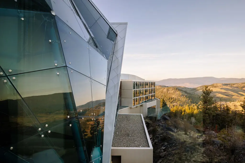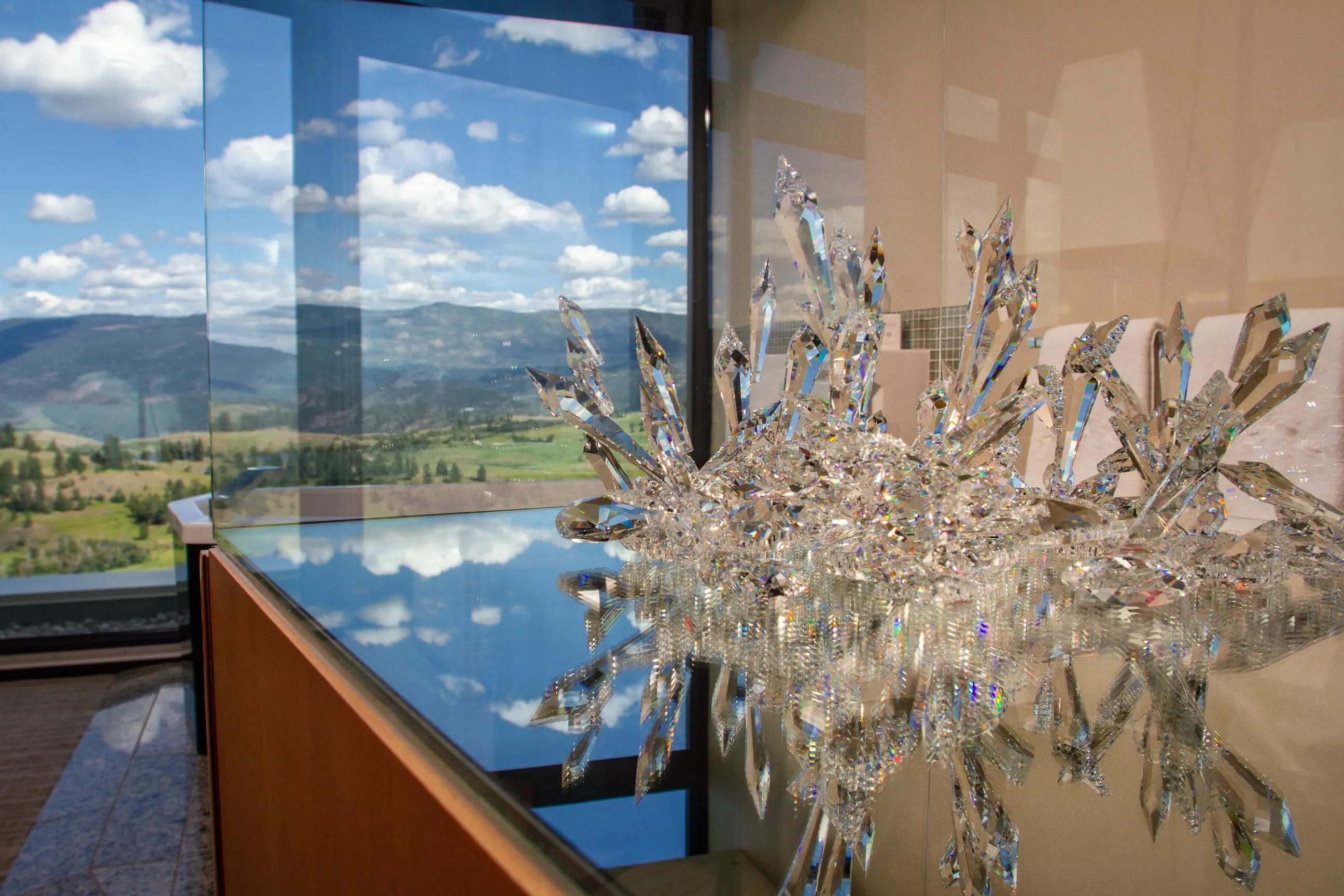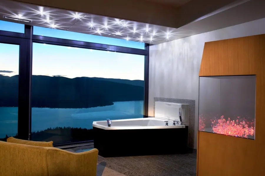 The approach to Sparkling Hill Resort builds anticipation. You leave the vibrant city of Vernon and follow a winding road up into the Predator Ridge community. The property sits on a granite bluff high above Okanagan Lake, and as you drive upward the view broadens until the resort’s modern glass façade appears at the top. The building glitters in the sunlight thanks to the more than 3.5 million Swarovski crystals that are integrated throughout the architecture. Conceived by Gernot Langes-Swarovski, patriarch of the Swarovski family, the resort was designed to bring European spa traditions to the Okanagan. From its hilltop perch you can see the Monashee Mountains to the east and Lake Okanagan to the west, setting the scene for a restorative getaway.