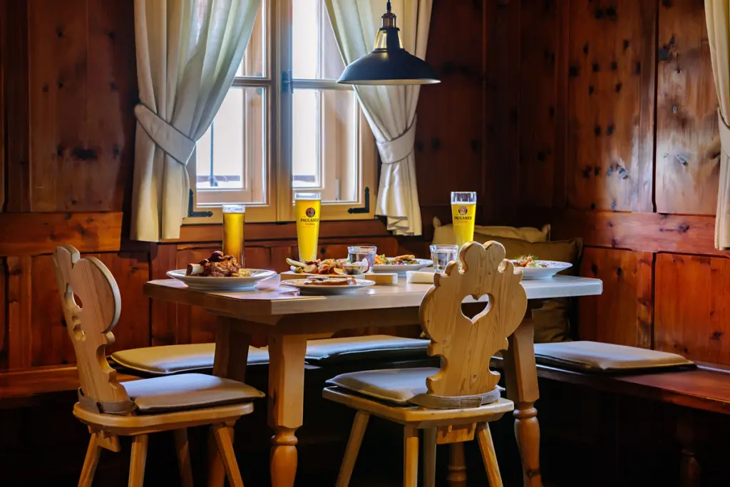 Our favourite meal was at Gerni’s Farmhouse, a rustic restaurant that transported us back to some memorable meals we had on a road trip we took through Bavaria and Austria nearly a decade ago. Named after the resort’s owner, Gernot Langes-Swarovski, the restaurant celebrates traditional Austrian fare and architecture. The building itself is a 16th-century farmhouse from Weerberg, Austria that was dismantled in 2019, shipped across the Atlantic, and meticulously rebuilt on site.