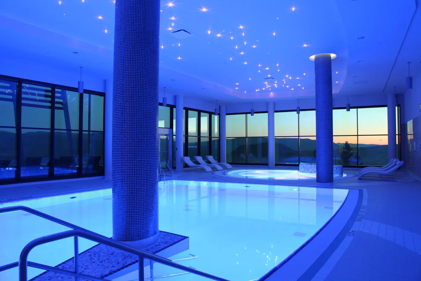 Beyond the saunas, KurSpa encourages relaxation through water. The heated outdoor infinity pool overlooks Okanagan Lake and the surrounding mountains. It is open year-round, so you can float in warm water even while snow blankets the hills in winter. Indoors, the hot pool is designed to improve circulation, and the serenity pool plays soft underwater music beneath a ceiling studded with Swarovski crystals. The Kneipp Hydrotherapy walkway, with alternating hot and cold chambers, sits adjacent to the pools and offers a bracing reset between heat sessions.