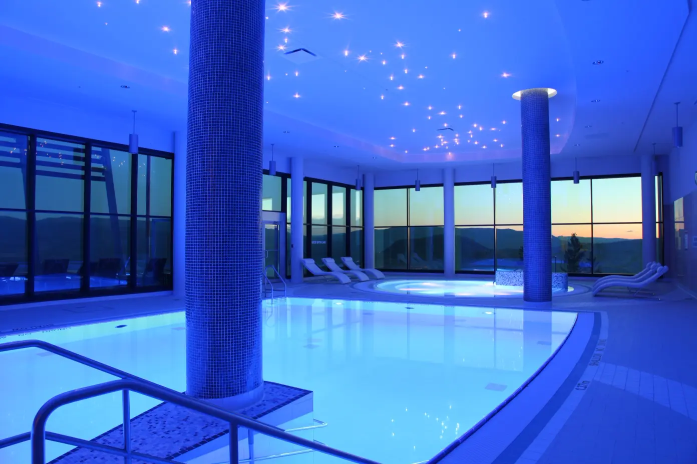 The heart of Sparkling Hill is KurSpa, a 40,000 sq ft wellness complex that blends the German word for healing with the Latin word for water. Designed around the European hot-cold-rest cycle, KurSpa features steam rooms and saunas, movement and fitness studios, as well as indoor and outdoors pools. Spa access and treatments are exclusive to resort guests, and the facility is adult-only.